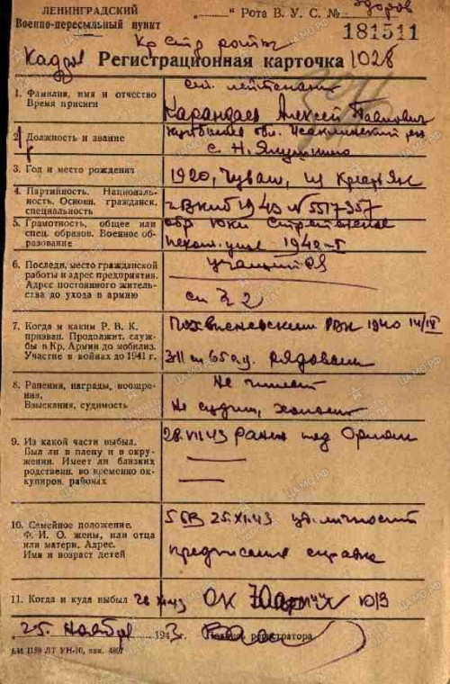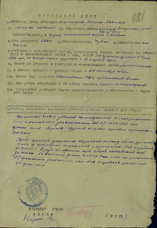 15.05. 1920 -15.07. 1944Карандаев Алексей Павлович (1920 г.р., чуваш из крестьян), был призван 14 сентября 1940 года. Окончил пехотное училище в 1942 году, на фронте командовал ротой составе 896 стрелкового полка 211 стрелковой дивизии; 28 июля 1943 года был ранен под Орлом. За проявленную храбрость старший лейтенант Карандаев был награжден орденом Отечественной войны II степени; при взятии села Тросно в бою рота Алексея Павловича уничтожила 57 человек личного состава противника.
