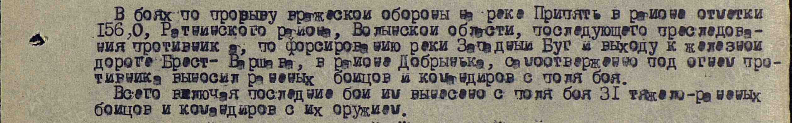 В боях по прорыву вражеской обороны на реке Припять в р-не отметки 156,0, Ратниковского р-на, Волынской обл., последующего преследования противника, по форсированию реки Западный Буг и выходу к железной дороге Брест-Варшава, в р-не Добрыньки, самоотверженно, под огнем противника выносил раненых бойцов и командиров с поля боя. Всего, включая последние бои, им вынесено с поля боя 31 тяжело раненых бойцов и командиров с их оружием. Был награждён Орденом Красной Звезды.