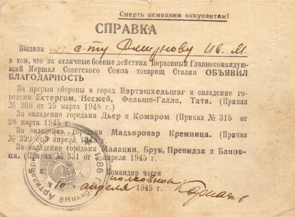 — за прорыв обороны в горах Вэртэшхедьшэг и овладение городами Естергом, Несмей, Фельше-Галла, Тата (Приказ № 308 от 25.03.1945г.)