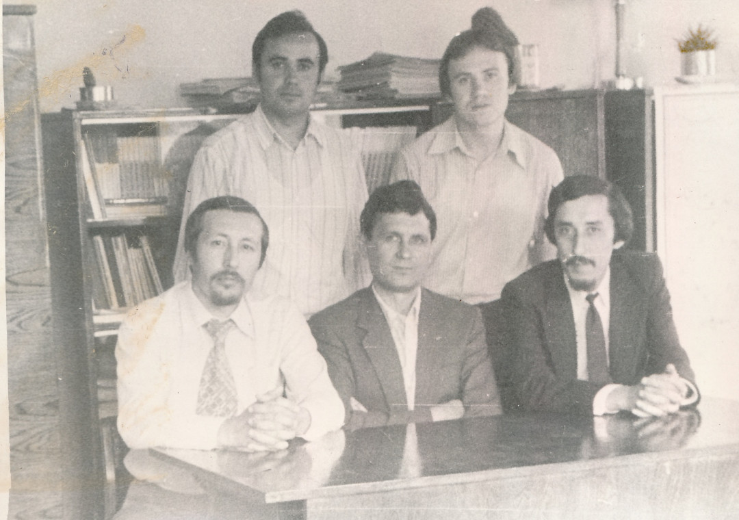 4. Старший научный сотрудник Чувашского научно-исследовательского института языка, литературы, истории и экономики В.Г. Родионов, Г.Ф. Юмарт (Трофимов), доцент кафедры чувашского языка и тюркологии ЧГУ им. И.Н. Ульянова А.П. Хузангай (сидят, слева направо). На заднем плане стоят: студент ЧГУ им. И.Н. Ульянова Г.Л. Никифоров, младший научный сотрудник института В.А. Ендеров. 1982 г. ГИА ЧР. Ф. Р-3018. Оп. 2. Д. 10.