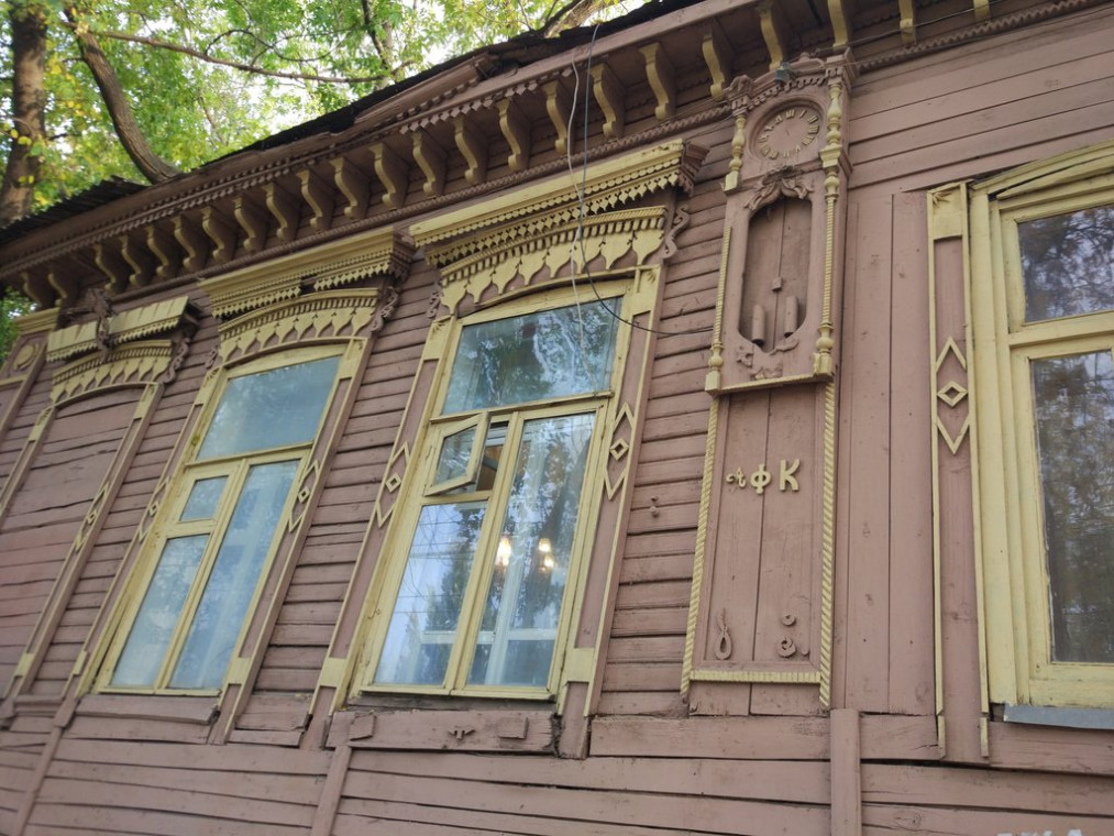 В простенке на фасаде дома на Коммунистической, 5 мы видим деревянные «остановившиеся» часы-ходики с гирьками в изящном резном футляре и с вензелем «АФК» – Андрей Фролович Кожевников.
