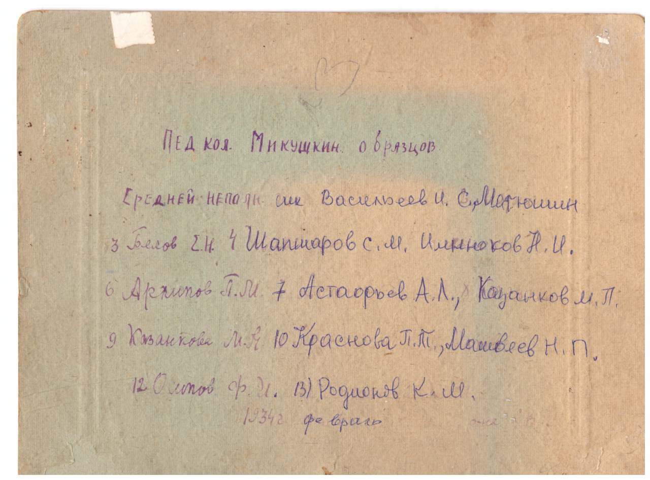 На фотографии 1934 года, педагогический коллектив Микушкинской образцовой неполной средней школы.