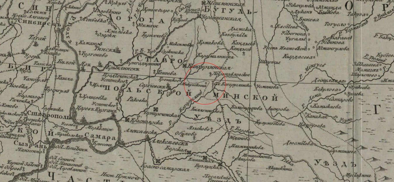 Фрагмент генеральной карты Казанской губернии Фёдора Чёрного 1779 года: на карте указана деревня Микушкина, судя по значку церкви еще нет.
